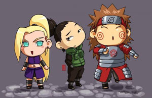 Все в команде Шикамару повторяют образы своих отцов в одежде, так Чоджи и Ино носят одинаковые сережки.