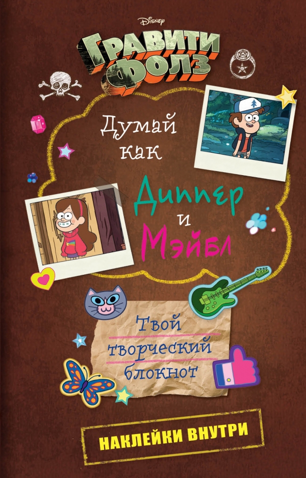 Привет, мы близнецы Диппер и Мэйбл Пайнс, а в руках у тебя бессовестно клевый блокнот. Почему бессовестно? Да потому что он лучший! Серьезно! Записывай в него идеи, мысли, мечты, рисуй, создавай скетчи - одним словом, твори и фантазируй! Стань неординарным, непохожим на других и немножко сумасшедшим! Отпусти на волю свой креатив! В этом блокноте ты найдешь наклейки и сможешь с их помощью украсить не только его страницы, но и вообще любой предмет. Например, свитерочек. Если ты, конечно, его свяжешь, как Мэйбл... Или новую кепку, как у Диппера. С таким блокнотом ты точно готов к путешествию в Гравити Фолз!