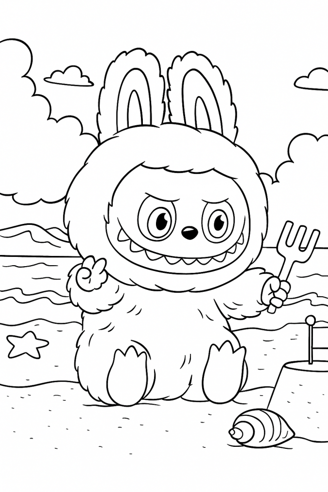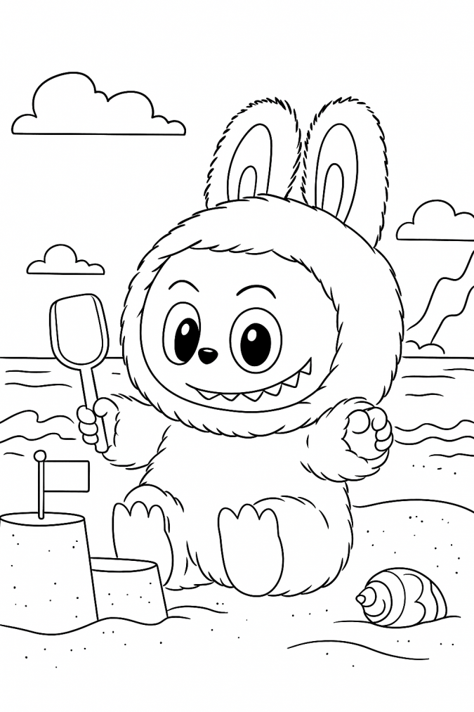 Идеальный лист для маленьких строителей. Лабубу с лопаткой и флажком на фоне моря. Простые формы делают его отличным выбором для младших детей.