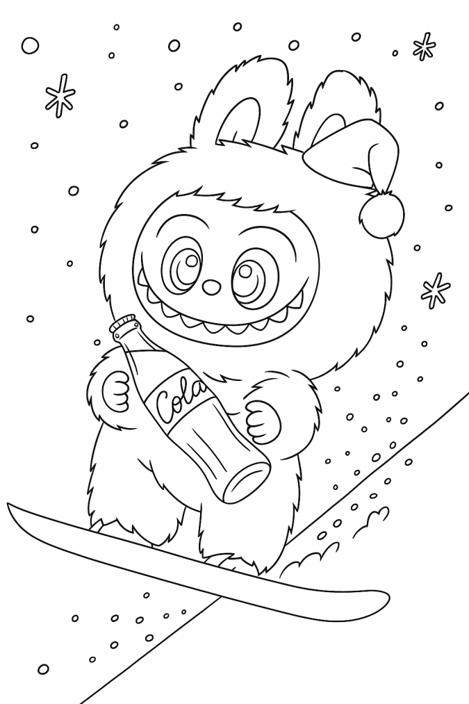 Зимняя сцена с динамикой — Лабубу мчится по склону на сноуборде в маленькой праздничной шапочке. Подходит для раскрашивания холодными оттенками и весёлых зимних настроений.