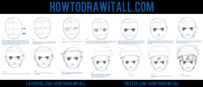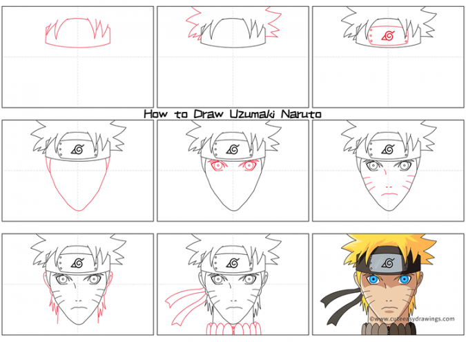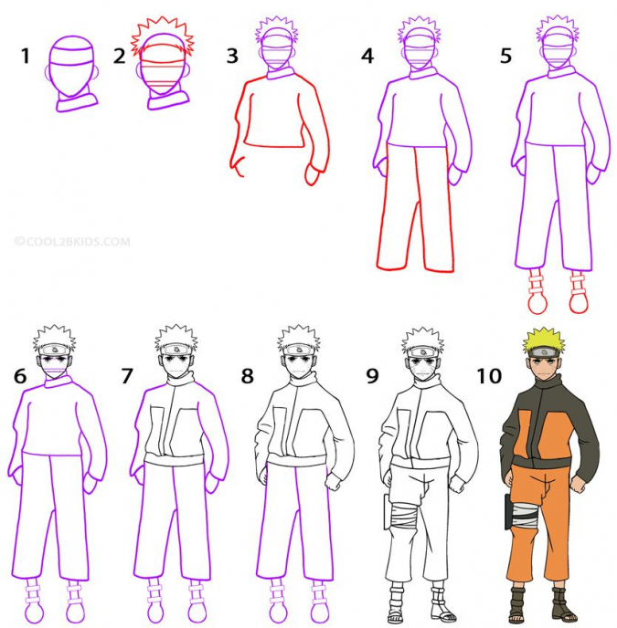 Научись рисовать Наруто Узумаки несколькими способами. Здесь ты найдешь пример рисунка как Наруто в детстве, так и времен аниме Наруто Шиппуден.
