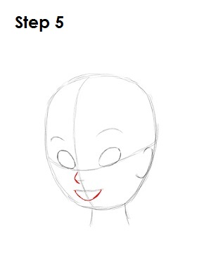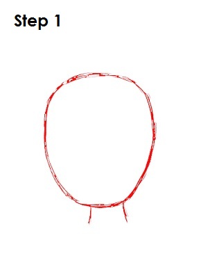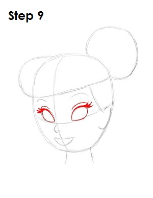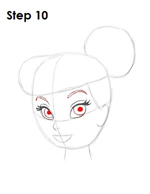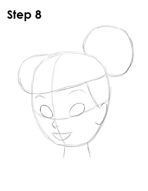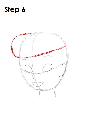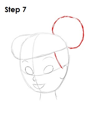 На втором этапе вам нужно дорисовать остальную часть прически, в целом повторяющую форму головы, а также нарисовать объемную шишечку из волос. Используйте неровные линии для рисования верхней части прически Динь.