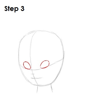 Теперь нужно нарисовать контуры глаз. Контур по форме напоминает овал обычного куриного яйца. Обратите внимание, контуры глаз должны располагаться над вспомогательной горизонтальной линией. Левый контур должен еле касаться вертикальной вспомогательной линии.