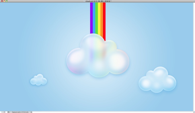 Шаг 18. Попробуйте добавить в рисунок радугу. Ее можно создать с помощью семи прямоугольников, покрашенных в нужные цвета. Затем следует слить слои с прямоугольниками в один и добавить размытие по Гауссу на ту часть радуги, которая находится под облаком. Это создаст иллюзию того, что радуга находится за облаком и просвечивает сквозь него.