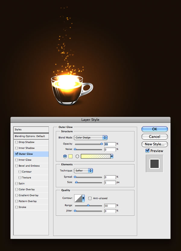 Используя “Layer Style” (стили слоя), примените “Outer Glow” к слою с искрами, с параметрами приведёнными ниже....
