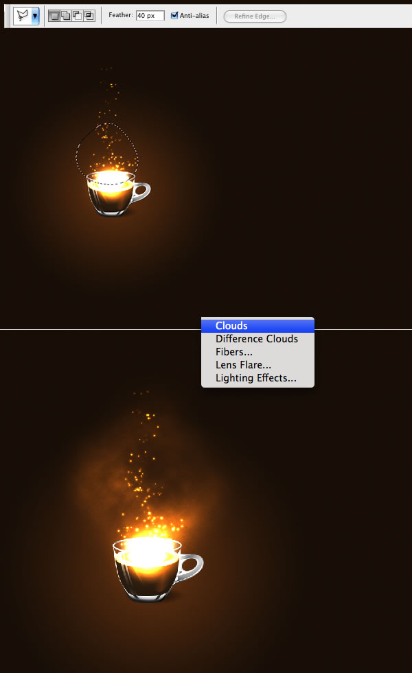 Давайте вставим какой-нибудь “дымок”. Сменим “Blend mode” на “Color dodge” и выберем инструмент “Lasso Tool”. Установим 40px для “Feather” (перо) и создадим выделение, как это сделал я на рисунке ниже. После этого удостоверимся, что цвет “Foreground” у нас белый, а цвет “Background” черный и применим (Filter>Render>Clouds) и продолжим применять этот фильтр пока не получим наилучший вид облачности. Для получения лучшего эффекта можно уменьшать прозрачность слоя.