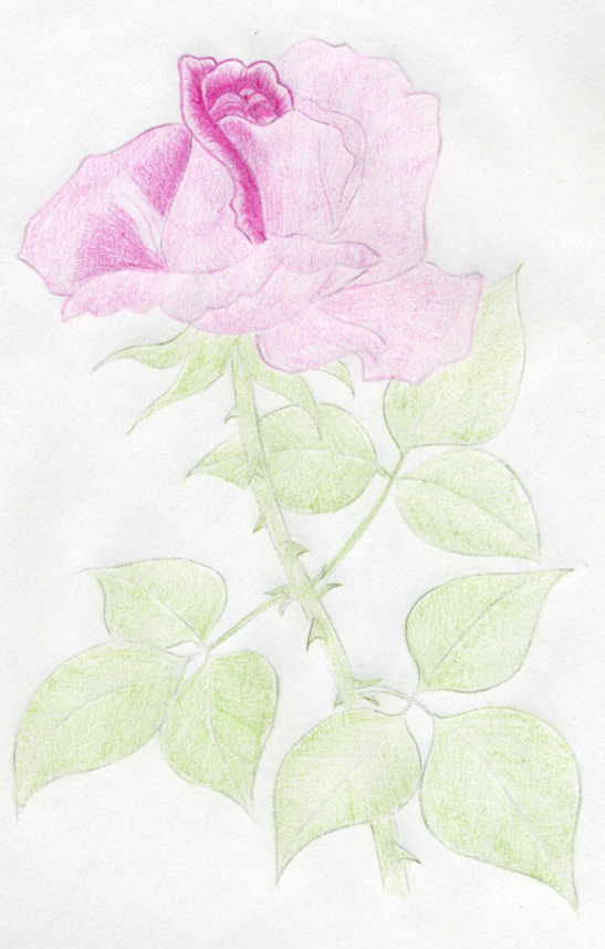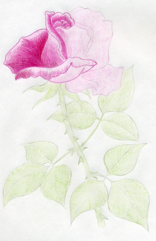 Сейчас мы закончили создавать набросок розы, и теперь рисунок можно раскрасить. Для этого контуры рисунка можно слегка осветить стирательной резинкой, а затем контуры бутона обвести цветным карандашом розового цвета, а стебель и лепестки - зеленого.
