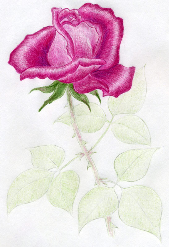 Сегодня мы будем учится поэтапно рисовать розу со стеблем, а также мы будем учится красиво раскрашивать её цветными карандашами.