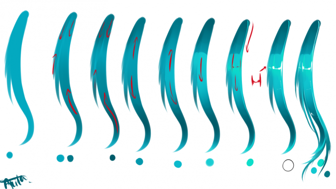 Первым делом нанесите базовый цвет, затем затемните нужные участки. После этого начните добавлять светлые элементы сначала с помощью базового цвета, затем используя более светлые тона, вплоть до белых бликов. Волосы всегда смотрятся более живыми и красивыми когда вы добавляете в рисунок отделившиеся от общей массы волос пряди.