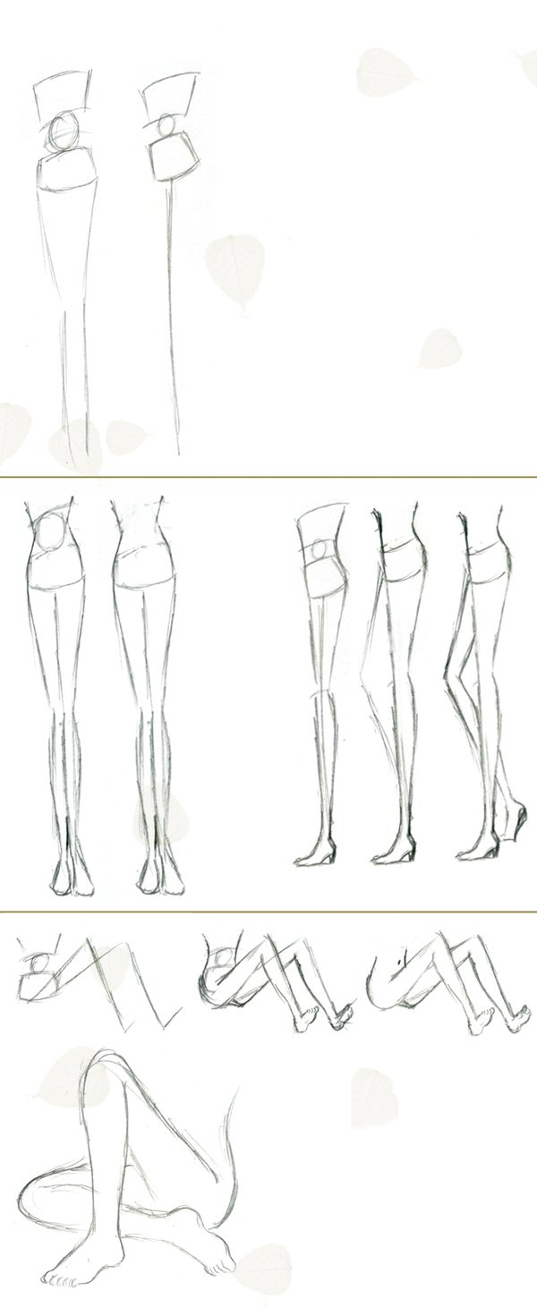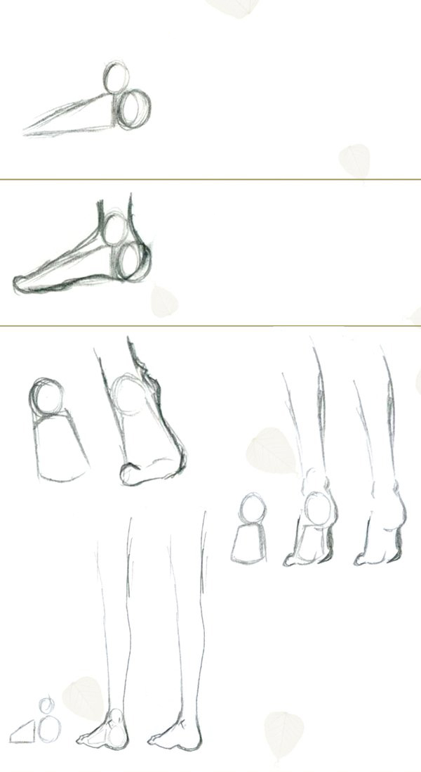 Тоже самое касается процесса рисования ног. Начинайте с линий и элементарных фигур.