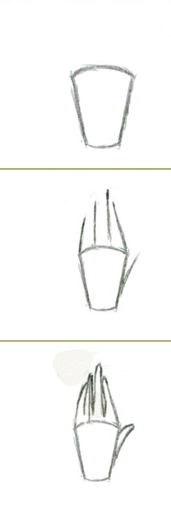 Процесс рисования рук очень упростится если ты начнешь их рисовать с наброска основных фигур, образующих контуры кисти рук. А затем постепенно добавишь в рисунок плавные линии и детали.