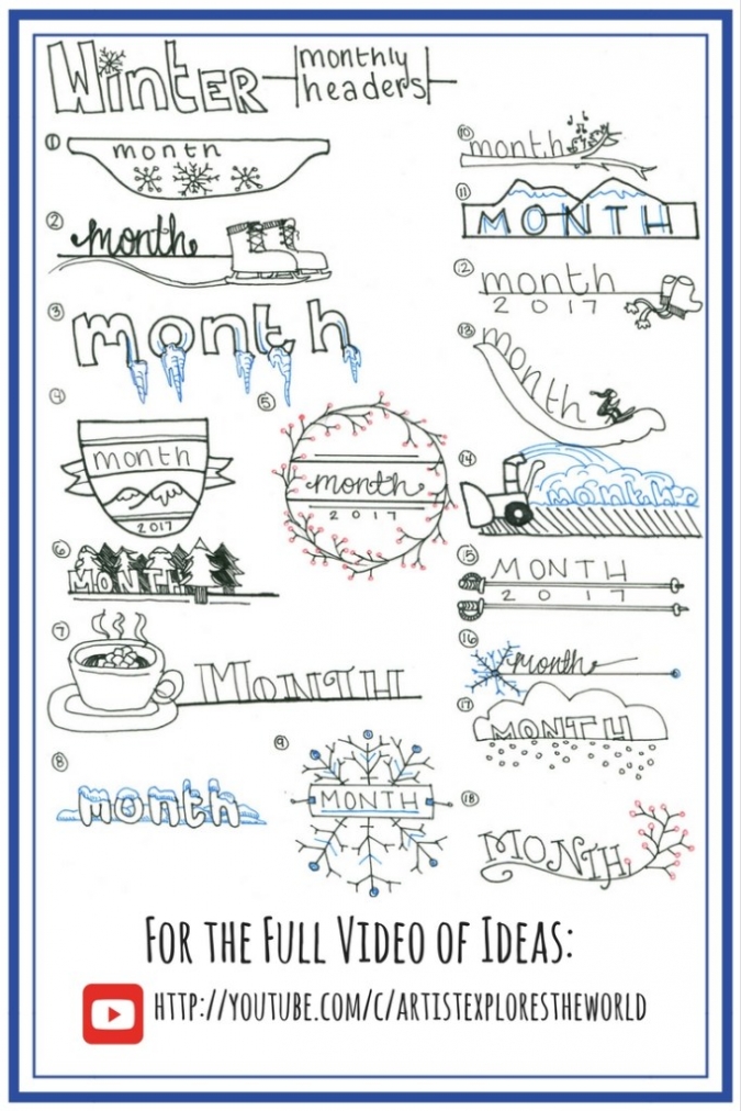 Идеи оформления названия месяца в Bullet Journal или личном дневнике