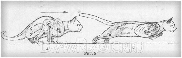Когда распрямляется позвоночник, вытягивается и грудная клетка, так как она состоит из подвижных ребер, и расстояние между ними может увеличиваться. Обрати внимание на центр тяжести у кошки на рисунке 8,а: он висит, ничем не поддерживаемый, и, тем не менее, кошка уравновешена. Тут вступают в силу законы механики. Кошка для более мощного прыжка сосредоточила основной вес своего тела в задней части. Она подтянута задние лапы под живот, тем самым создав наибольший размах для прыжка. Мощный толчок — и кошка «летит». На самом деле, «летит» центр тяжести, ведь любое движение начинается именно с него.
