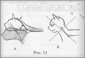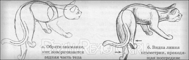 Всегда помни что о дальних, не видимых на рисунке конечностях (рис. 9,а), здесь они заштрихованы. На первых порах их стоит прорисовывать тонкими линиями, чтобы лапы не «выскакивали» из самых неожиданных мест, как на рисунке 9, б.