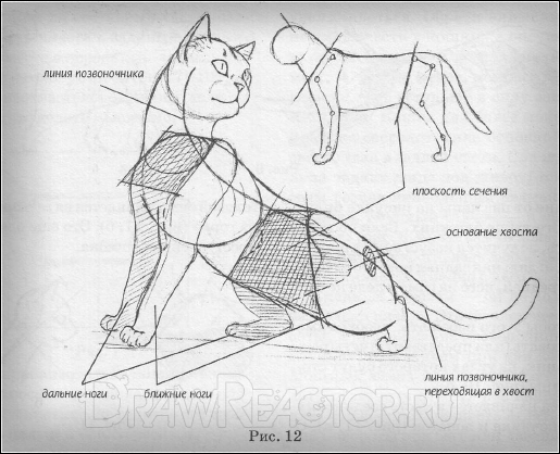 Чтобы правильно построить дальние и ближние конечности по отношению друг к другу, можно провести сечения по телу кошки. Одно по плечам, в месте соединения шеи с телом, одно — по талии (рис. 12). Когда кошка стоит к нам боком, конечности совпадают, и эти плоскости не видны. Если же она стоит вполоборота, они тоже поворачиваются к нам.