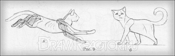 «Заметь, как кошка ставит задние лапы. Скакательные суставы немного сближаются, от чего кошка кажется косолапой. Кстати, это относится ко всем животным.»