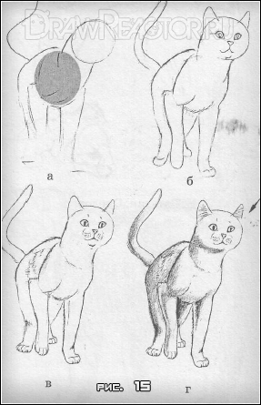 Последний этап (рис. 15,г) — сразу наметь тени. На этом рисунке свет падает на кошку справа и сверху, поэтому мы видим на шее падающую тень от подбородка, на задней левой лапе, и, естественно, на всей правой стороне кошки.