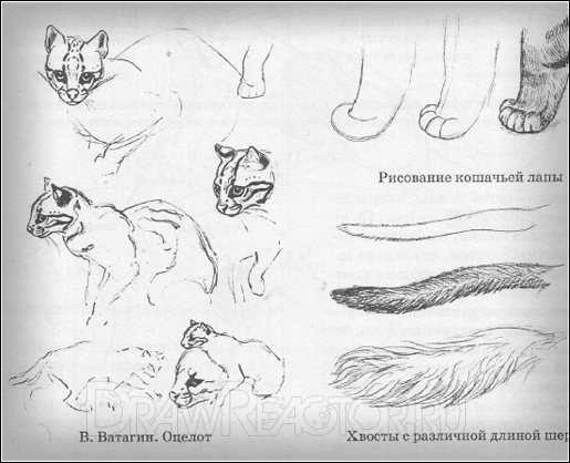 Работая с натурой, хорошо применять такой метод: рисовать на листе нескольких кошек. Пока кошка находится в одной позе, рисуй ее так. Только переменила позу — на этом же листе начинай новый набросок. Кошка все равно вернется в предыдущее положение, тогда и закончишь первый рисунок. Посмотри, как это делал замечательный художник-анималист Василий Ватагин.