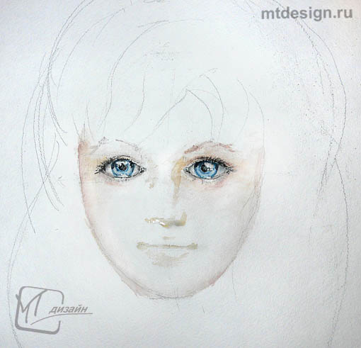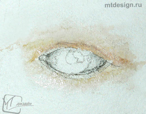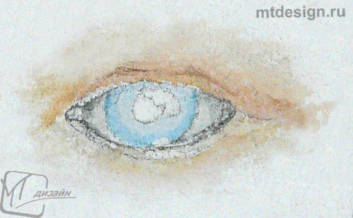 Глазное яблоко (там, где глаз у человека белый) закрасьте бледно-серым цветом, бледным в середине и усиленным немного по краям, чтобы придать глазу объем. Старайтесь делать все очень прозрачно. Если не хватает цвета, лучше потом пройти еще раз.