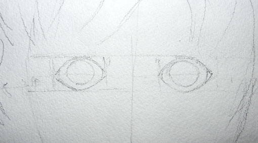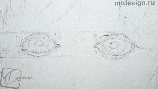 Очень тяжело в первый раз нарисовать глаза одинаковыми. Один все время старается получиться больше или меньше другого. Поэтому не поленитесь воспользоваться вспомогательными линиями. Я не буду давать детальное построение глаза — это будет в более сложном уроке карандашом.