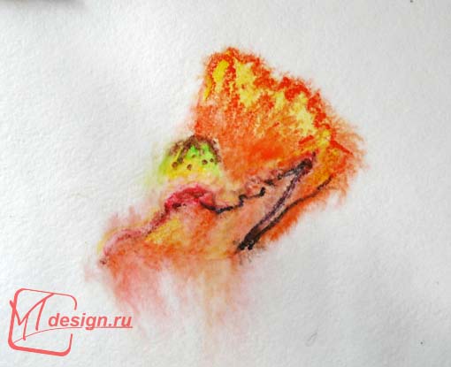 Закрасим листик внутри оранжевым, желтым и коричневым карандашом.