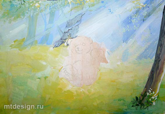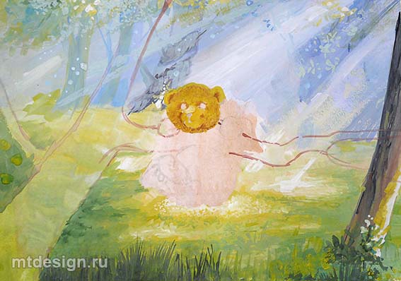 В верху темно-зеленой краской делаем несколько мазков кистью, создавая листья. А внизу длинными штрихами рисуем траву. Потом закрываем мишку бумажкой и брызгаем чуть-чуть белой и желтой краской.