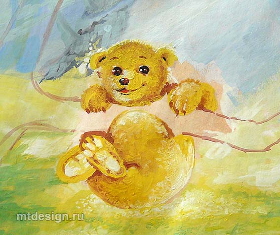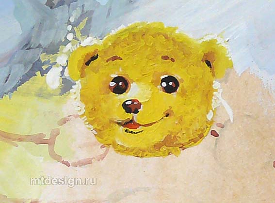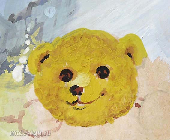 Прорисовываем основное дерево и ветку, на которой кувыркается медвежонок. Одновременно тонкой кистью небольшими мазками начинаем рисовать мордочку мишки, смешивая желтую, охру и коричневую краски.
