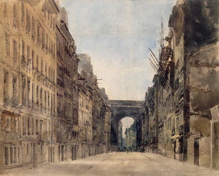 Двухточечная перспектива встречается гораздо чаще и приветствуется художниками. Это может быть сцена на улице или в помещении, где зрителя окружают различные предметы, стены. Сцена в таких случаях простирается в нескольких направлениях, все из которых стремятся сойтись в точках на горизонте. Обычно в двухточечной перспективе существует левая и правая точка схода на горизонте, куда стремятся предметы. Часть стремится к левой точке, часть к правой. Так же встречается эта перспектива с верхней и нижней точкой схода прямых. Последняя не совсем понятна, но я объясню, что это такое. Это может быть случай, когда человек идёт вперёд и смотрит вверх, либо он идёт вперёд по улице с небоскрёбами. В таких случаях, когда человек смотрит вверх, создаются две от точки схода – одна ниже его взгляда, туда уходит дорога и низы зданий и верх, где будут сходиться вертикальные прямые, подчёркивая высоту зданий.