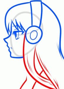 Дорисуй контуры прически, нарисуй ниспадающие длинные волосы. Также нарисуй наушники.