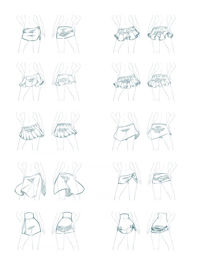 Эти картинки подскажут тебе как ты можешь рисовать юбки на своих рисунках. На одном из рисунков показан пример рисования юбок спереди и сзади. Обрати внимание на то, что юбка сзади всегда слегка короче (из-за особенностей строения нашего тела).