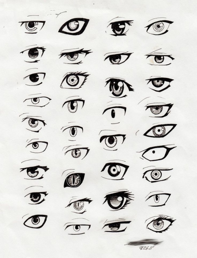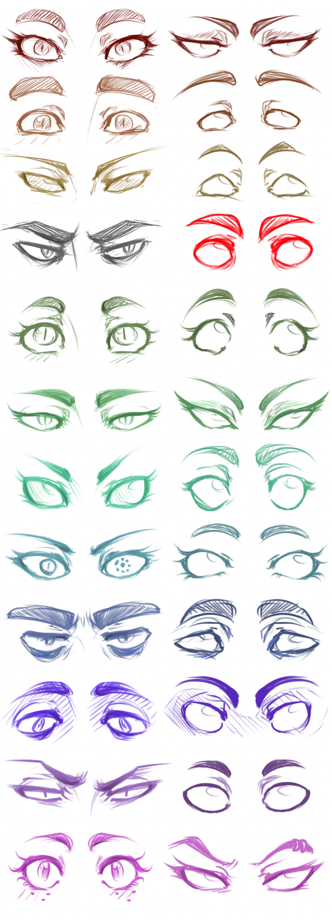 Изучи примеры рисунков глаз и бровей, попробуй нарисовать понравившиеся, возможно слегка изменив форму и цвет под своего персонажа. А затем постарайся нарисовать глаза в своем уникальном стиле, уже не повторяя за авторами этих набросков.