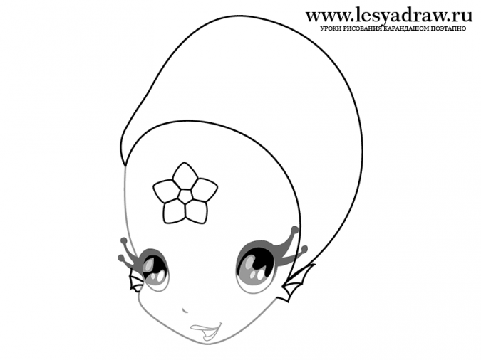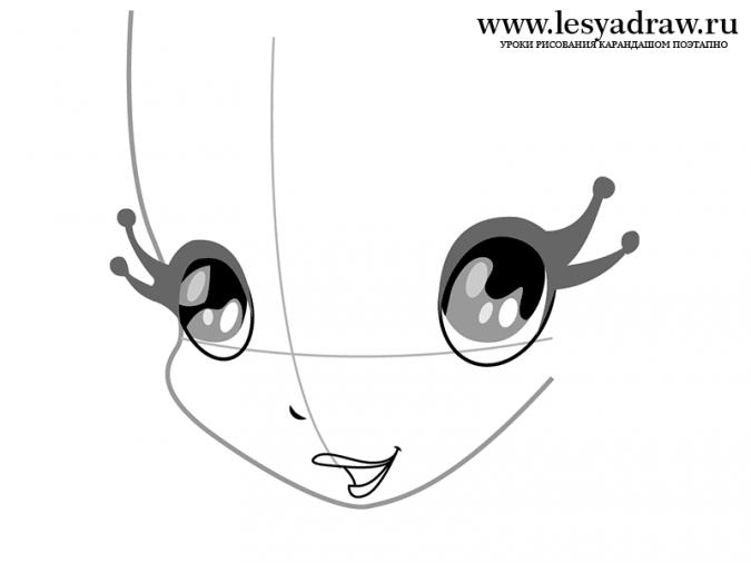 2. Сначала рисуете овальные глаза, затем ресницы, они у нее темно-синие, поэтому если рисуете простым карандашом слишком темными их не делайте. Потом рисуете темный зрачок, блики и радужную оболочку глаза, нос и рот.