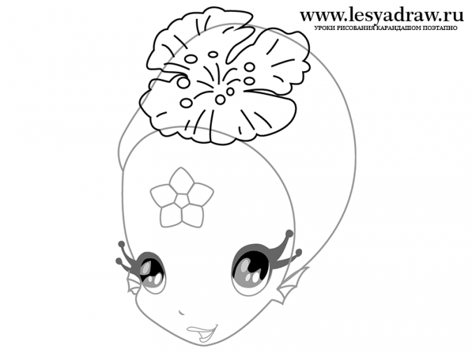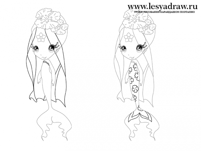3. Рисуем головной убор у селки, на лбу цветок и уши в виде жабр.