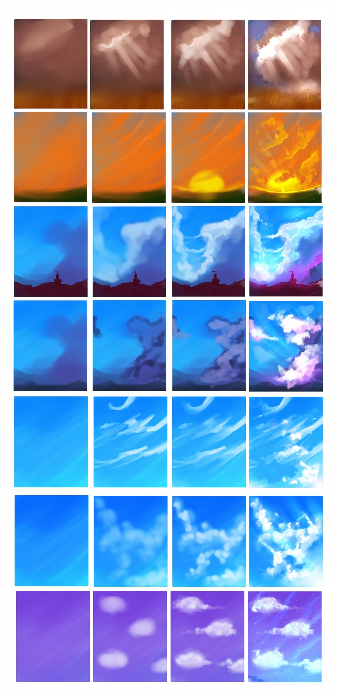 Картинка с примерами того, как можно нарисовать утреннее небо и облака, вечернее небо, дневное и даже ночное небо.