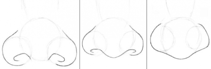Когда вы рисуете вид носа спереди, 3 основных круга видно, кончик носа и два крыла. Чтоб точно установить пропорции носа, сначала зарисуйте размещение и размер носа относительно лица. Потом визуально измерьте линейное соотношение каждой части к носу, и соответственно нарисуйте эскиз. Зарисуйте пропорции типичного вида в профиль трёх основных типов носа.