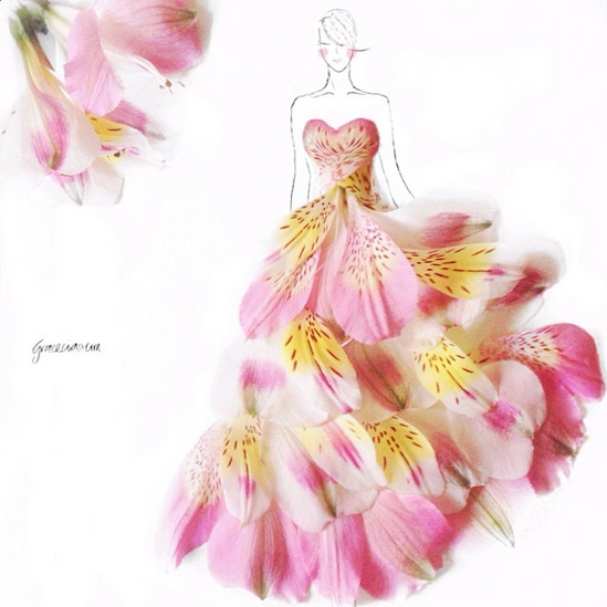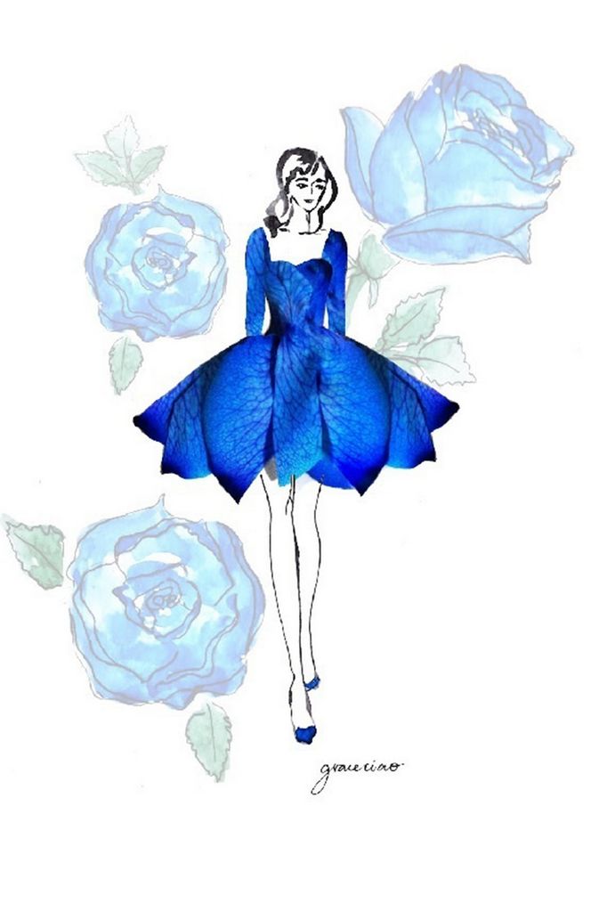 Грейс Чао (Grace Ciao) - иллюстратор моды из Сингапура. Она использует в своей работе всевозможные цветы от лилий и голубых ирисов до роз и орхидей, и создает из них дизайны потрясающих платьев. Причем Грейс очень тщательно подбирает цветок к каждому фасону своего платья, учитывая и его цвет и структуру цветка.
