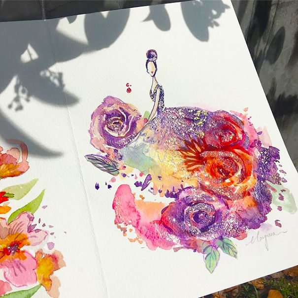 Дизайнер Chan Clayrene из Сингапура нашла интересное применение лаку для ногтей. Она использует его в своих иллюстрациях красивых платьев.