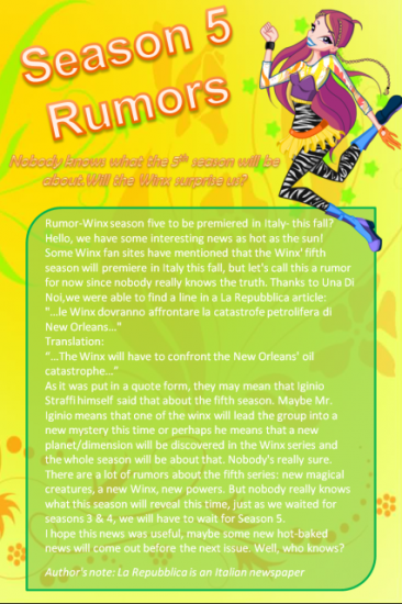 Я перевела не знаю с какого на русский) Вот текст с картинки: Слухи о пятом сезоне Winx, премьера которого состоится в Италии, этой осенью? Привет у нас есть некоторые интересные новости, как теплое солнце! Некоторые фан-сайт winx've упомянутых пятого сезона Winx будет дебют этой осенью, но назовем его слух, потому что никто не знает, verdade.Obrigada''Una Di Noi.'' Нам удалось найти проход в статье La Repubblica: ''... Le Winx dorvranno affrontare ла катастрофы Petrolifera ди Новый Орлеан ...'' перевод: ''... Винкс придется столкнуться катастрофы нефти, Новый Орлеан ...'' Эти разделы были заключены в кавычки, то они могут означать, что очень Iginio Страффи сказал примерно 5 temporada.Talvez Sr.Straffi хочу сказать, что одним из Winx приведет группы в новом тайна на этот раз или, может быть, он хочет сказать, что новая планета \ размер будет обнаружено в серии Винкс сезон, и все будет по isso.Ninguém не знает. Есть много слухов о 5 Темп. : Новые магические существа, новые Winx, новые полномочия, но никто не знает, что эта серия будет раскрывать сейчас, у нас будет ждать столько, сколько нам ждать в течение 3 и 4, мы должны ждать сезон 5. Я надеюсь, что эта новость является полезной, возможно, некоторые свежие новости приходят в следующем номере, а ... кто знает?