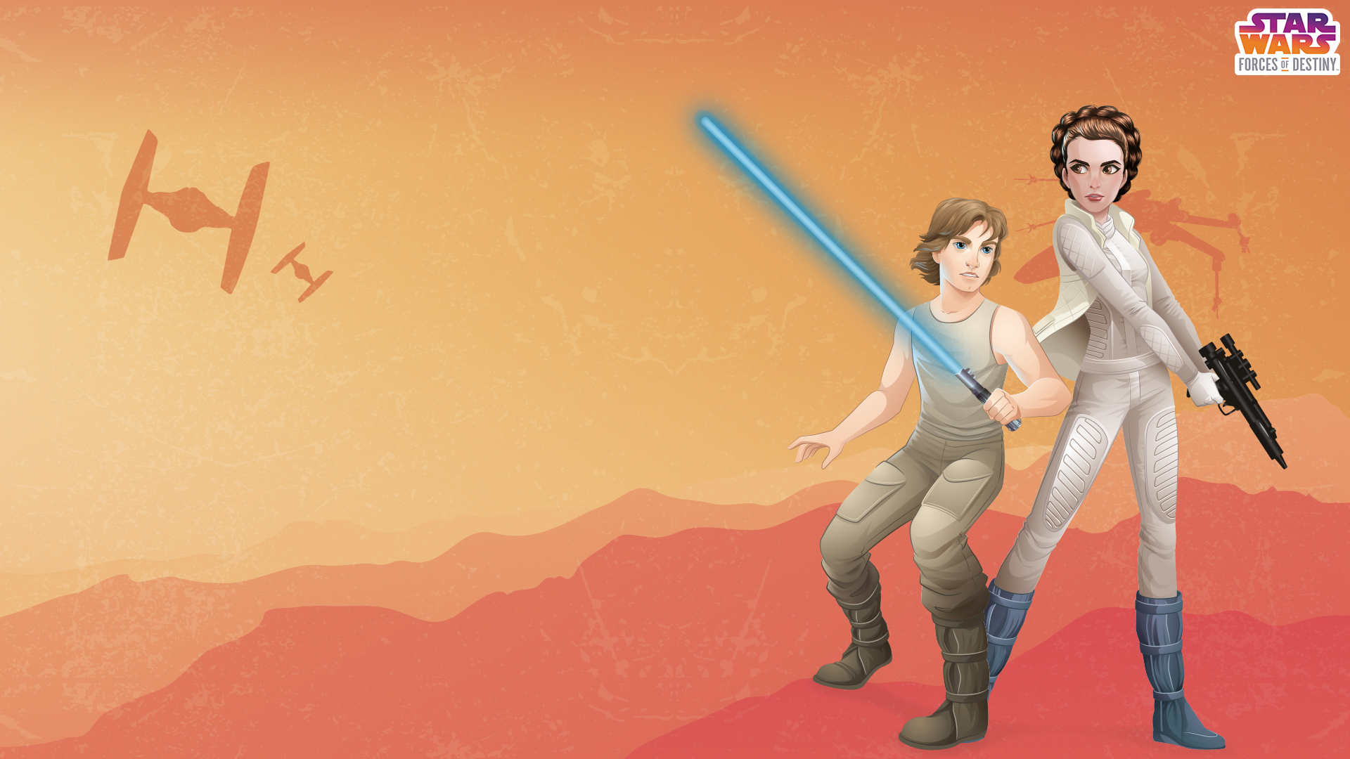 Чтобы скачать картинку Звёздные Войны Силы Судьбы заставка с принцессой Леей и Люком Скайокером нажми на нужное разрешение в таблице: