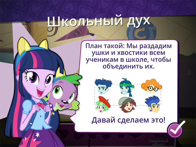 Не будем расписывать все уровни игры, так как проходить их одно удовольствие. Просто отметим, как весело наблюдать когда, например, ученики надевают ушки и хвосты по просьбе Твайлайт:).