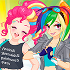 Помогите двум подружкам повторить образы их любимых персонажей из мультфильмов - Пинки Пай и Радуги Дэш. Выберите для каждой из них яркий макияж, прическу и современный наряд с интересными аксессуарами.