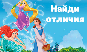 Ищи отличия на картинках с Золушкой, русалочкой Ариэль, Рапунцель, Тианой и Белль.