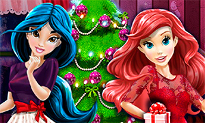 Помогите Жасмин и Ариэль нарядить ёлку и переодеться самим к празднику.