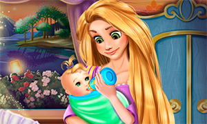 Очень красивая игра с принцессой Рапунцель и её маленькой дочкой, которой не спится.