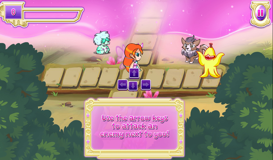 В начале игры для игры будет доступна только Блум. Используйте стрелки на клавиатуре чтобы отражать атаки злобных существ, или мышку. В самом начале игры во время обучающего этапа вам нужно будет начать на клавиши и провести мышкой рядом с Блум, чтобы закрыть блоки с обучающими картинками. Когда полоска энергии заполнится фея Винкс сможет использовать особую атаку во всех направлениях с помощью пробела.