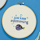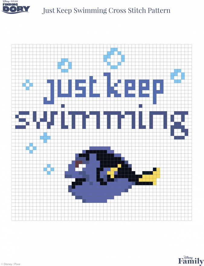В оригинальной версии слоган к мультфильму "В поисках Дори" звучит как "Just Keep Swimming", что переводится как "Просто продолжай плыть". Он вдохновляет двигаться вперед и идти к поставленной цели и мечте. В России слоган заменили на ничего не значащий вопрос «Вы ее не видели?». Такой слоган не вдохновляет и не мотивирует, поэтому мы решили добавить схему для вышивки рыбки Дори с изначальным слоганом "Just Keep Swimming", чтобы он вдохновлял тебя на твоей пути к исполнению желаний.