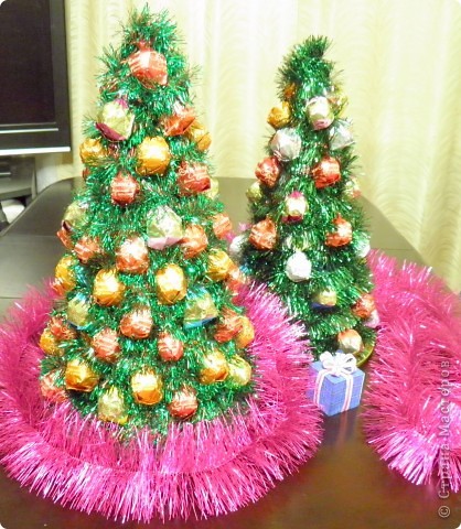 После этого аккуратно приклей кончик мишуры к вершине конуса и по спирали вниз начинай обматывать конус, пропуская мишуру под конфетами (для этого мы приклеивали за кончик, чтобы конфету можно было приподнять).