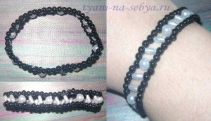 Плетем браслет в два этапа, по сложности почти не отличающиеся друг от друга. Набираем 48 черных бусин и замыкаем кольцо. Первое кольцо готово, нам понадобится два кольца, совершенно одинаковые по отношению друг другу. Второй этап, соединение двух рядов, за счет третьего посередине. Делается, как предложено в схеме ниже.