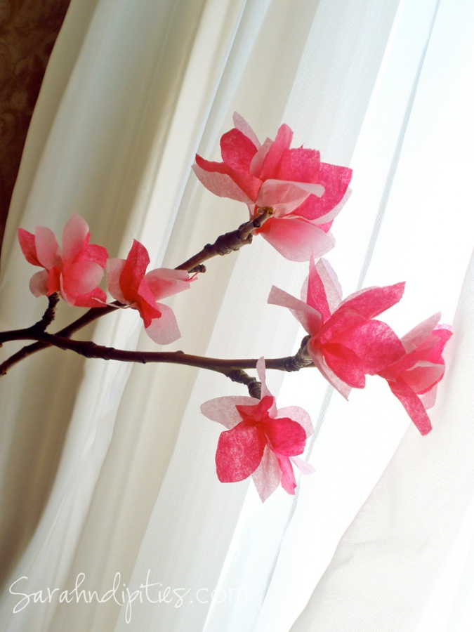 Для поделки тебе понадобятся: веточки без листьев, гофрированная цветная бумага двух оттенков розового цвета, ножницы и клей.