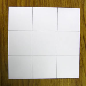 Возьми лист бумаги, из которой ты будешь делать корзинку, и положи ее цветной стороной вниз. Сделай разметку, как на фотографии ниже. Лист бумаги делится на 6 квадратов одинакового размера.